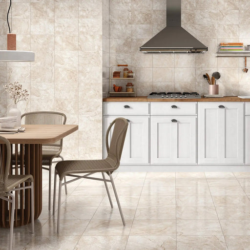 Disponible en color hueso en cajas de 1.82 m2 Medidas: 55 x 55 cm Material: Cerámica Diseño: Marmoleado Acabado: Brillante